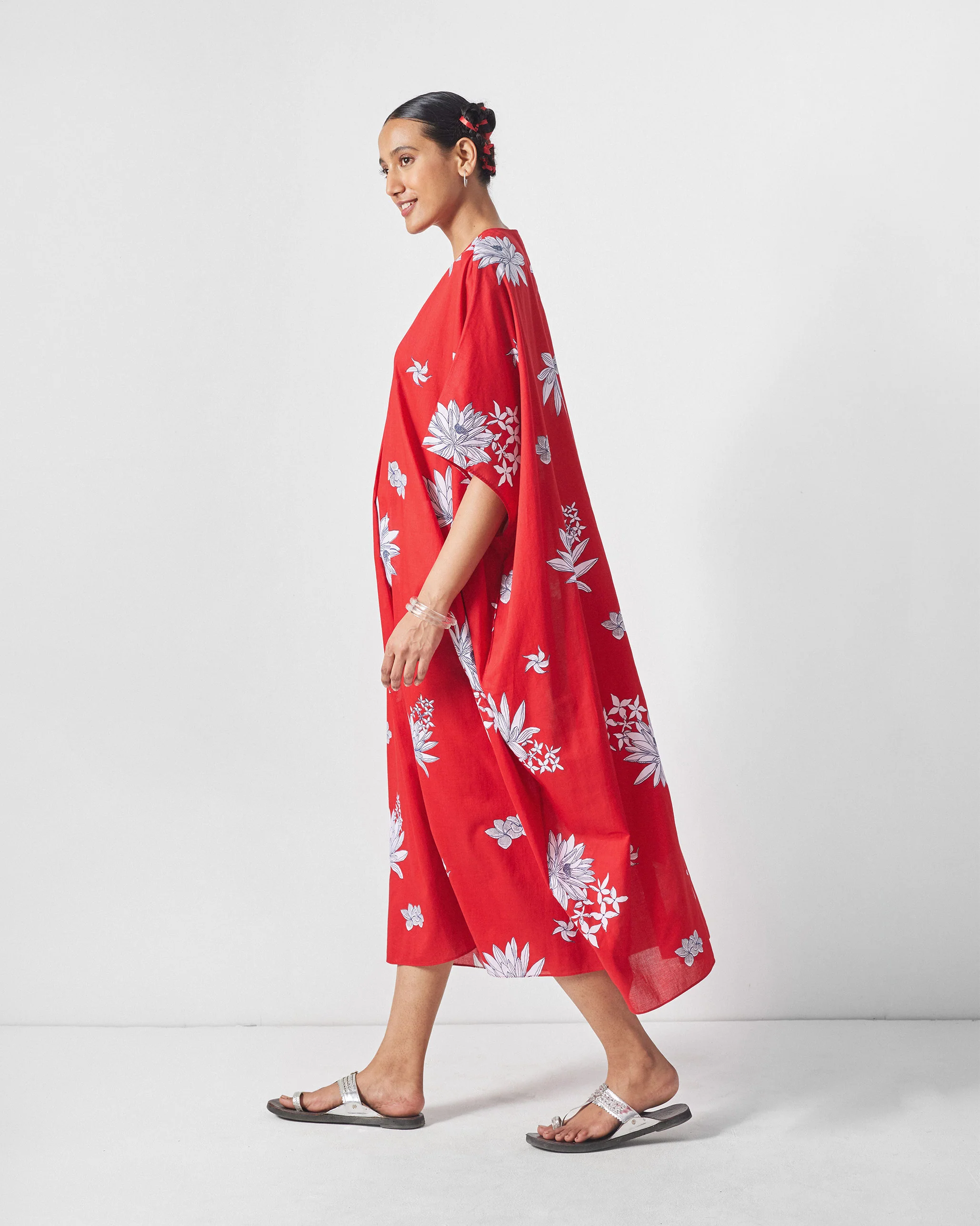- The Araya Kaftan flows easy in red, scattered with white lotus blooms—a print that balances softness with statement.