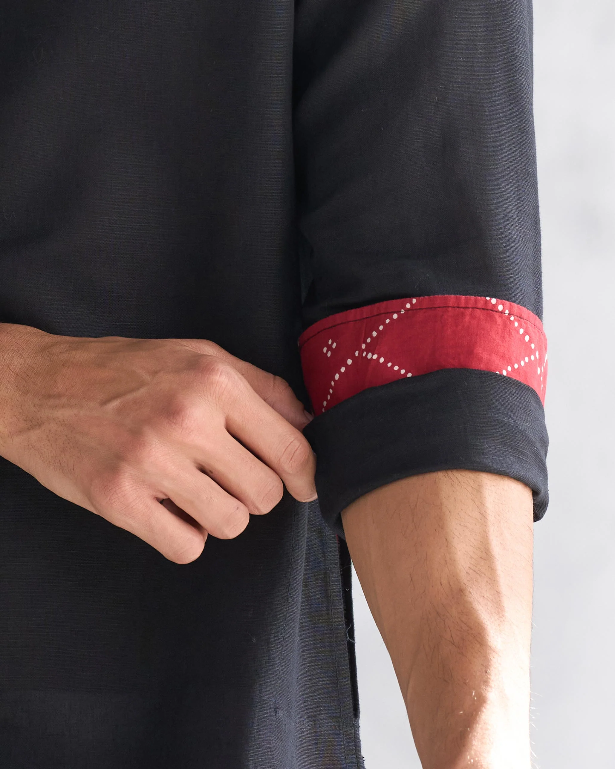 - Features a Nehru collar, full sleeves with contrast detail at the cuffs, and a lone red embroidered star at the back