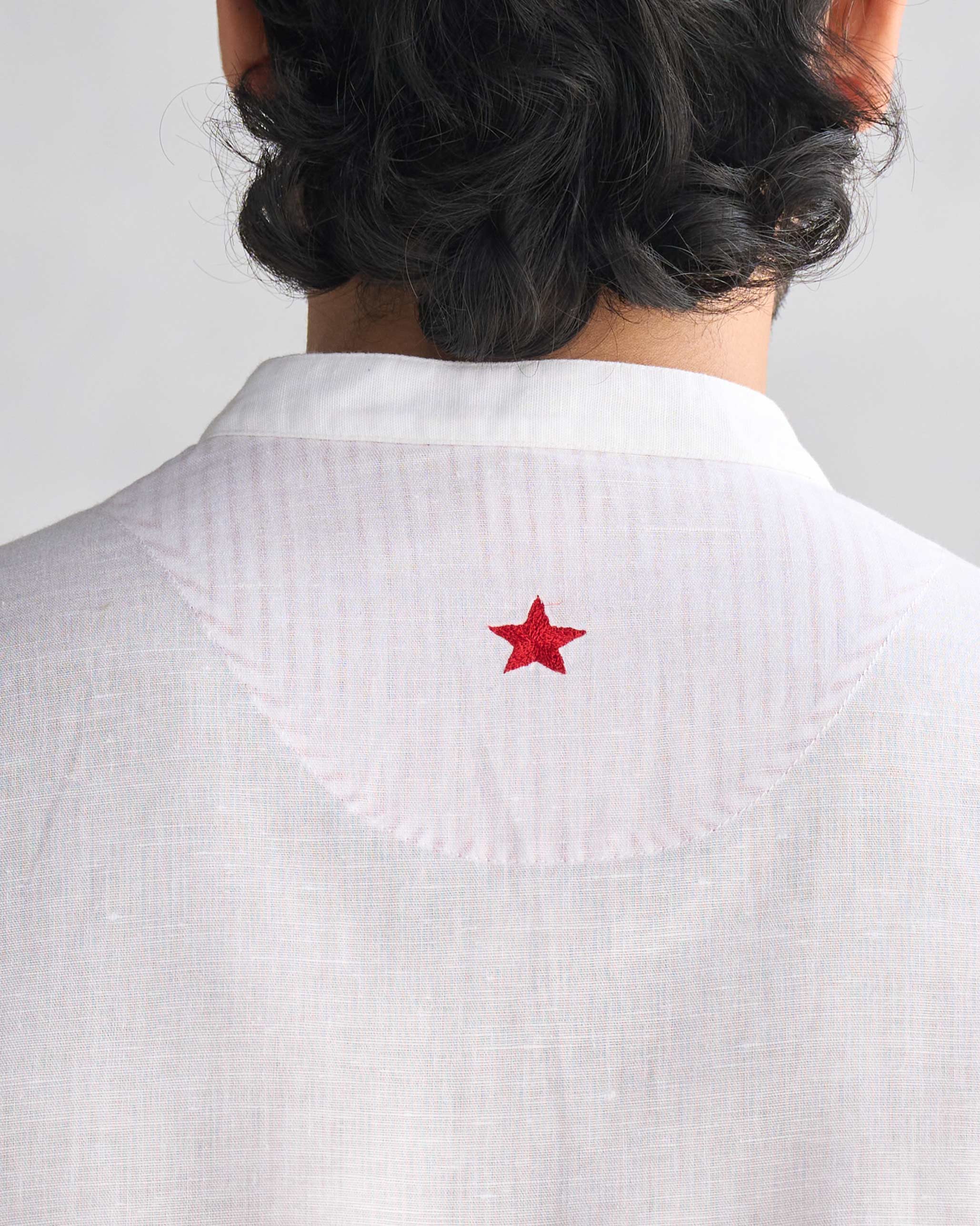 - Features a Nehru collar, full sleeves with contrast detail at the cuffs, and a lone red embroidered star at the back