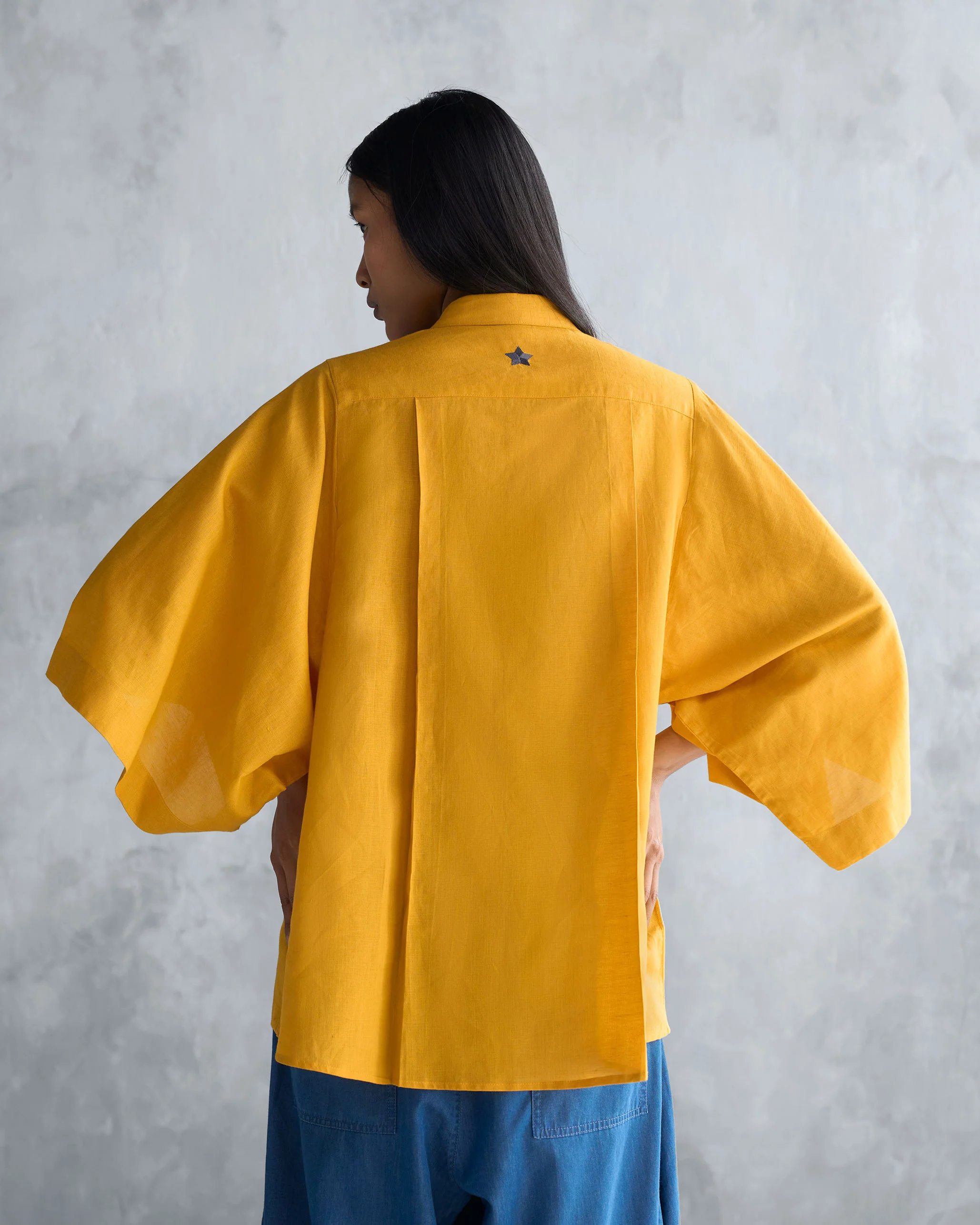 - Its ochre hue and versatile cut makes it easy to pair with any outfit, adding a touch of effortless style to your look. Plus, look out for the red star at the back!