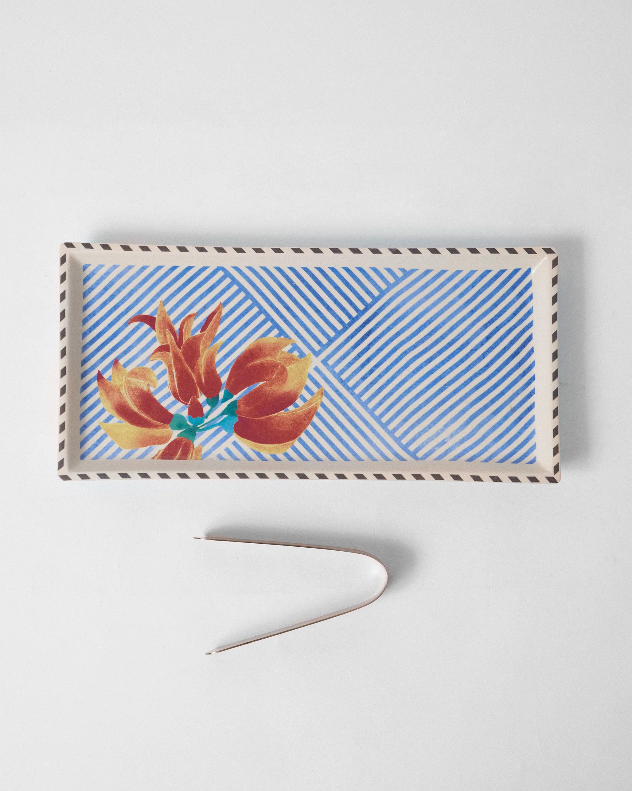- Inspired by the rivers of India, which connect people, cities, and rituals, we turn inward to where it all began. The Palash Cookie Tray with Tong brings the fiery beauty of Palash flowers to your table, featuring a bloom set against a striking blue and white striped background. Comes with brass-finished tongs.