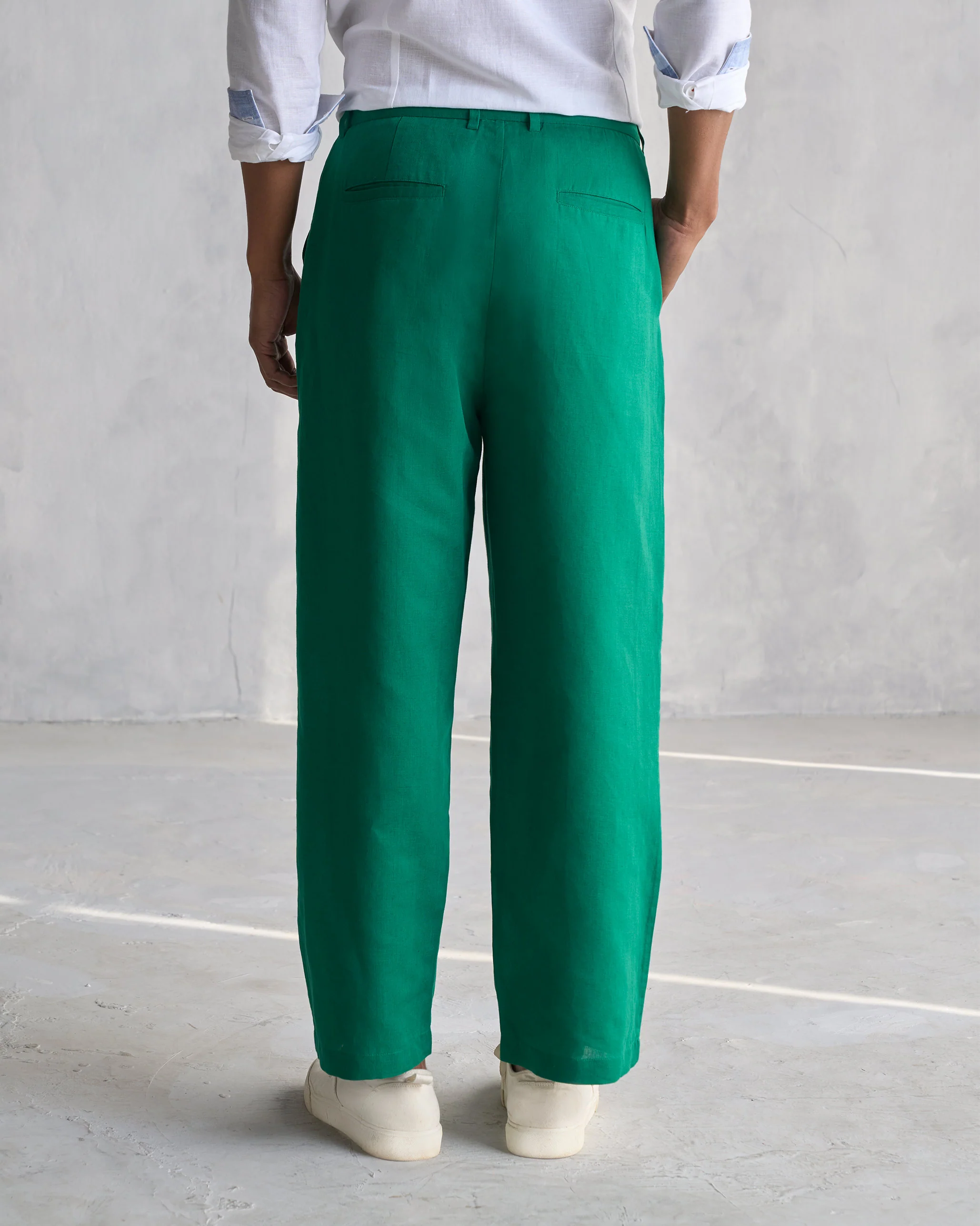 - This linen-cotton pair in trendy green is a wardrobe must.