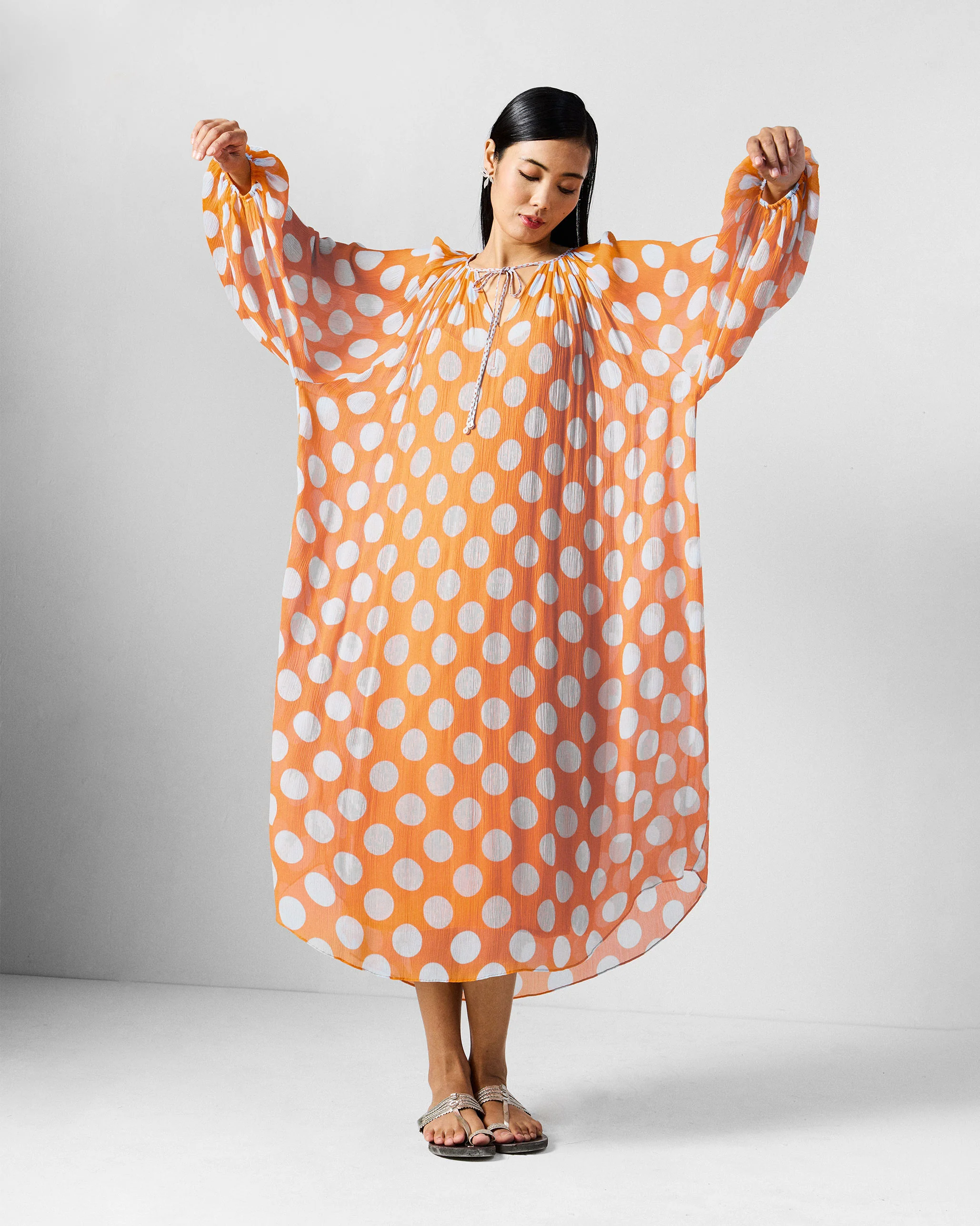 - The Sara Kaftan is a burst of colour in motion, where orange feels sun warmed and the print drifts lightly across the surface.