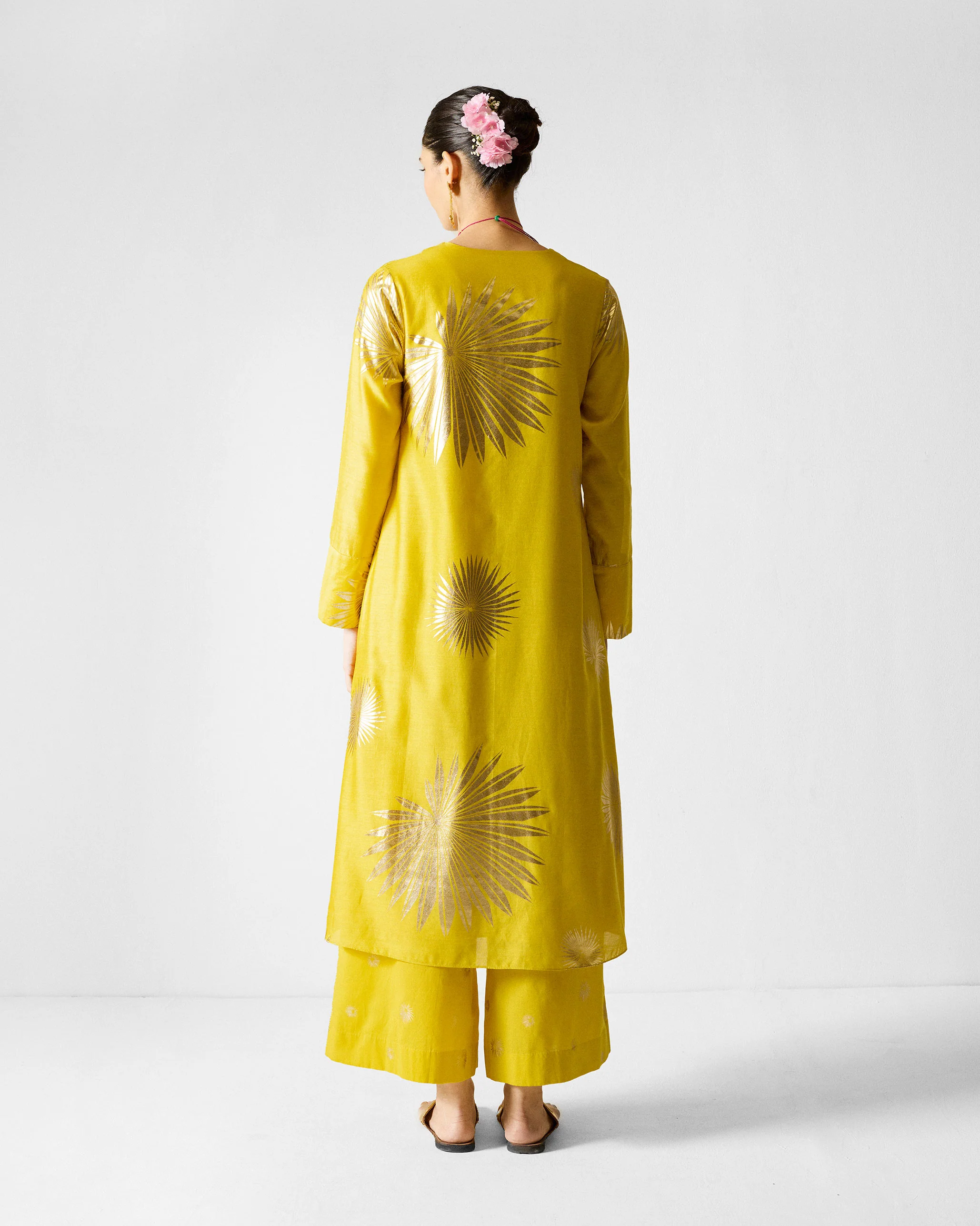 - Bright and bold, this flared kurta features a striking gold palm print creates a stunning contrast, bringing a touch of tropical elegance to your wardrobe. Crafted in luxurious cotton silk chanderi.